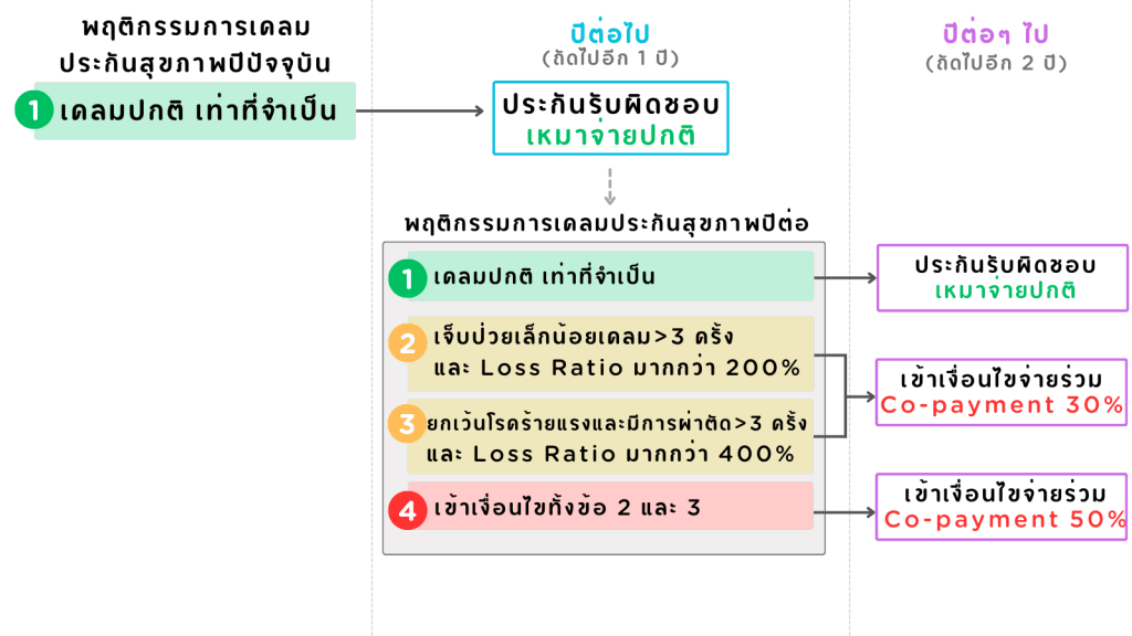 - หากนโยบายการจ่ายร่วมกำหนดให้ใช้เฉพาะเบี้ยปีต่อ ทุกคนสามารถทำประกันสุขภาพและได้สิทธิเหมาจ่ายปกติ เพียงแต่พฤติกรรมการเคลมประกันสุขภาพจะมีผลกับนโยบายปีถัดไปแทน